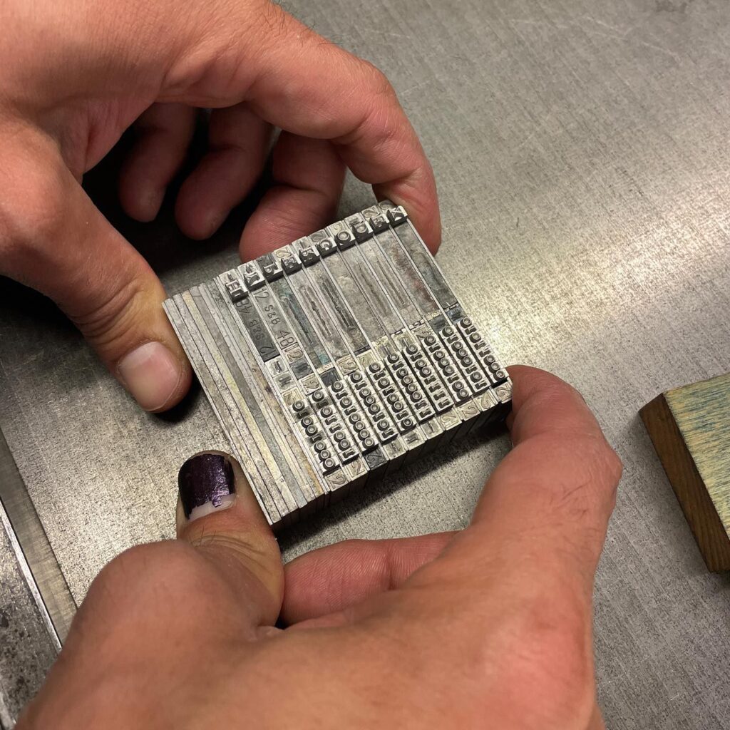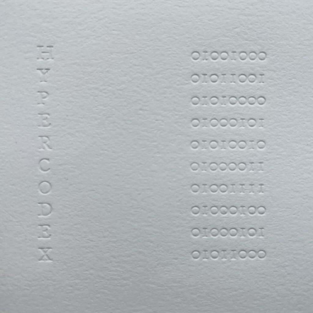 Judith et Tucker ont de leur côté combiné code binaire et presse typographique pour créer une impression sans encre reprenant le nom du projet de recherche-création Hypercodex. L’impression papier de ce langage de programmation se voulait une première exploration de l’hybridité entre l’usage traditionnel de la presse typographique et celui du numérique.