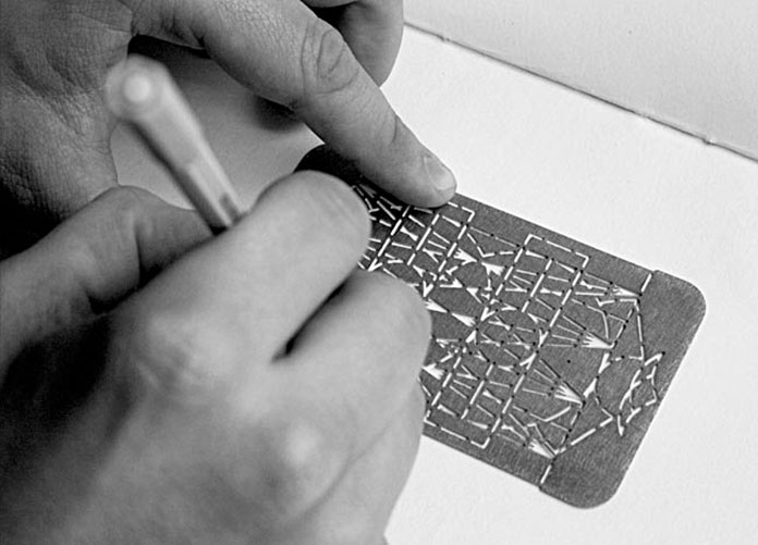 Au cours de cet atelier, Chi-Long nous présente la Plaque Découpée Universelle inventée par Joseph A. David en 1870, dans laquelle il est possible de dessiner toutes les lettres majuscules et minuscules.