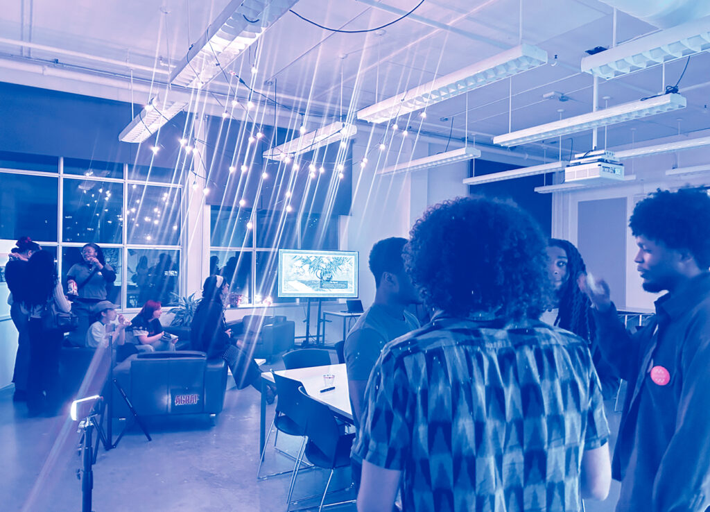 Le déroulement même de la soirée a confirmé cette logique de fabrication en situation. Malgré des changements de dernière minute liés aux conditions météorologiques (tempête de verglas !), l’événement a rassemblé un public nombreux composé d’étudiant·e·s de l’école, mais aussi de différents cégeps, de professeur·e·s, de participant·e·s du milieu professionnel et de personnes venues d’autres programmes et institutions. La mise en place de l’exposition, les ajustements techniques et l’organisation de l’espace ont donné lieu à de multiples formes d’entraide et d’initiatives spontanées, transformant l’événement en un processus collectif plutôt qu’en un dispositif entièrement planifié. Par sa dimension temporaire, collective et évolutive, cette édition pilote de L’expérience noire en design rejoint également l’axe mouvance perpétuelle d’Hypercodex, où le design ne se limite pas à un objet ni à une forme stable mais se déploie dans le temps, dans l’espace et dans les interactions. L’événement devient ainsi un espace produit par des gestes graphiques, des rencontres et des collaborations, dont la matérialité inclut autant les objets imprimés que les situations qu’ils génèrent.