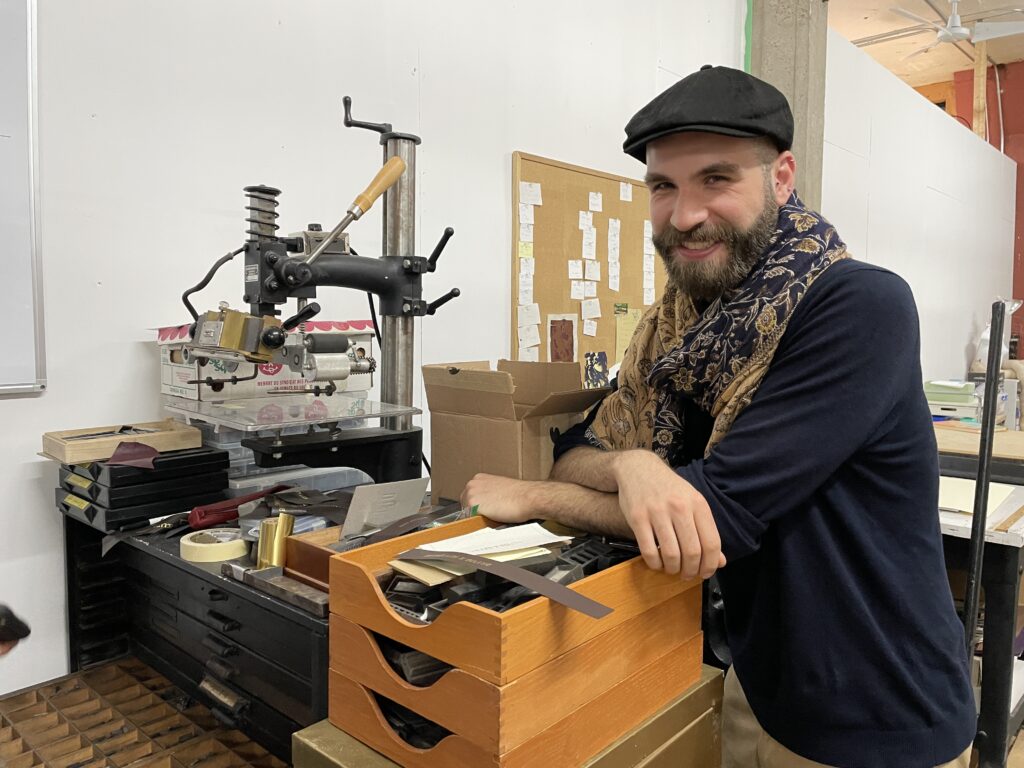 Last October we went to meet Yannick Allen-Vuillet, founder of one of the most recent (and ambitious) workshops in the Montreal book and paper landscape: Atelier Écluse. Despite having only opened in September 2022, the composition of the workshop itself attests to its integration in a long and ardent tradition of bookmaking in Montreal: the paper he uses was made by the Papeterie Saint Armand or the Atelier Retailles, his Challenge proofing press was acquired from the Atelier Universel, his Heidlberg platen hails from the printing arts center “L’imprimerie”, and a portion of his gilding tools come (indirectly) from Pierre Ouvrard. Yannick isn’t starting out, either, he studied visual arts at Concordia and is a trained paper maker and bookbinder.