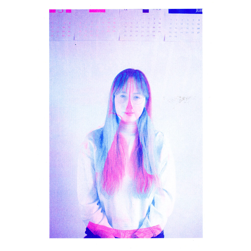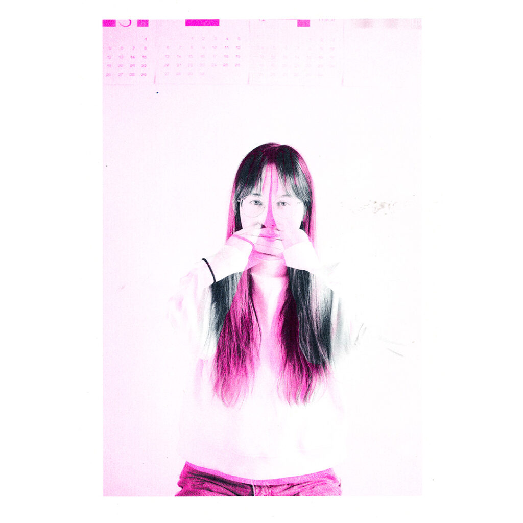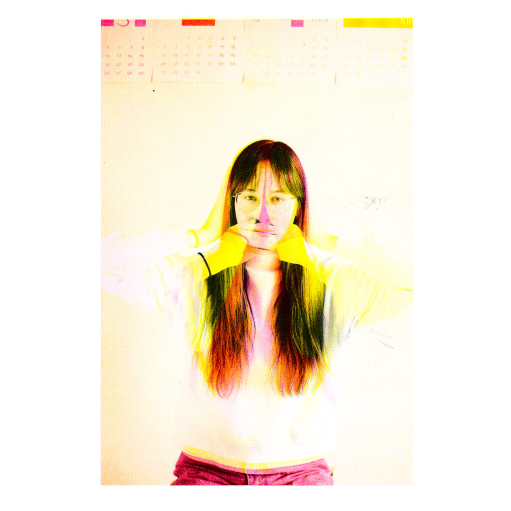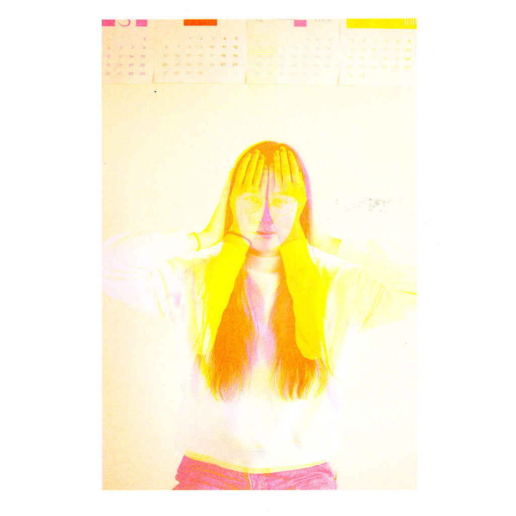 Animation of the experiments using Harris Shutter technique in false CMYK. Some images are composed of only two colors, others of three, and an image includes all 4 colors. Each of the colors is associated with a position (hands on the mouth, hands on the ears, hands on the knees, hands on the eyes). It is interesting to note the parts which appear and those which disappear according to the order of the passages of colors.