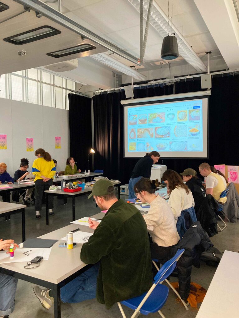 Picatelier is a collaboration between the Hypercodex research project and Pica magazine. The School of Design community was introduced to risography in a workshop based on the notion of programmed randomness, on the theme of caprice. The RISO technique was appropriate for its random results due to its prints, all of which are made unique by the shift in the positioning of the paper and therefore the colours from one time to the next. To frame the experiment, the participants were given a sheet of paper with instructions that were randomly associated with each other. The parameters imposed determined the colour, the screen, the proportion of space used by the visual, and the type of image to be represented (abstract or figurative).