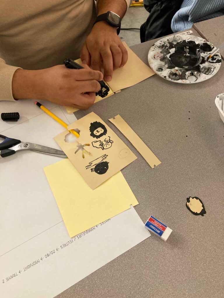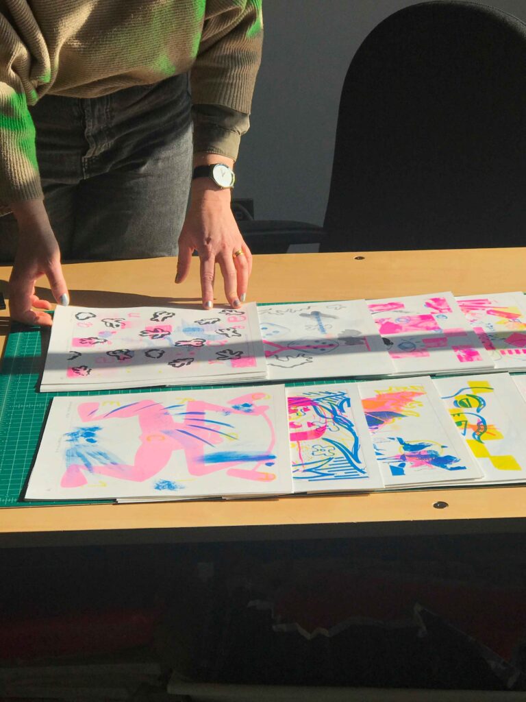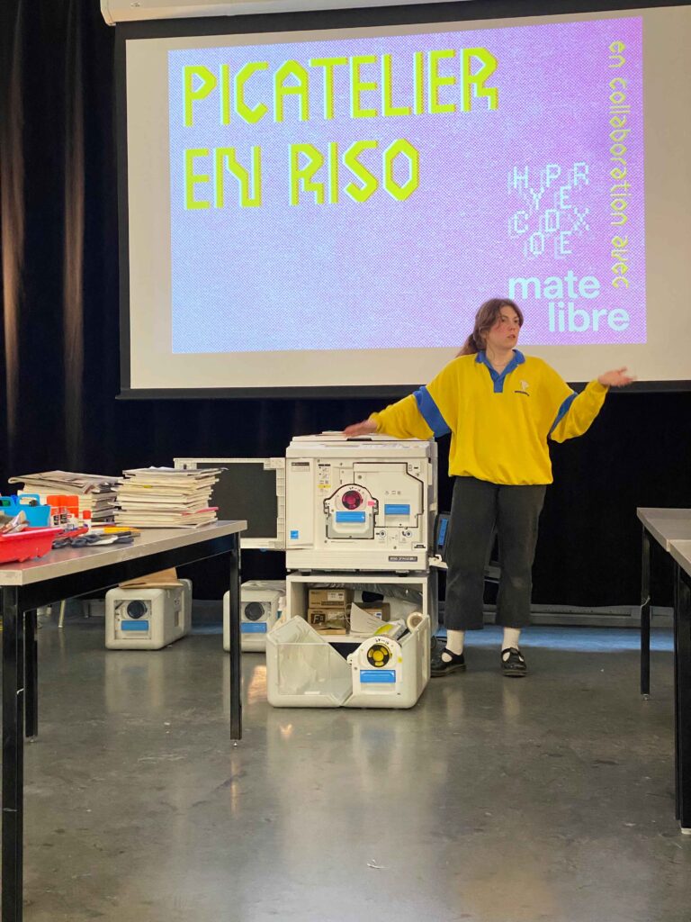 The workshop was led by Ève Lagüe, a member of Hypercodex, who shared her knowledge of risography with us with passion. The participants’ creations were made using collage techniques, painting and drawing.
