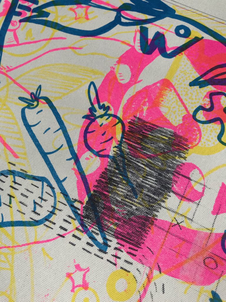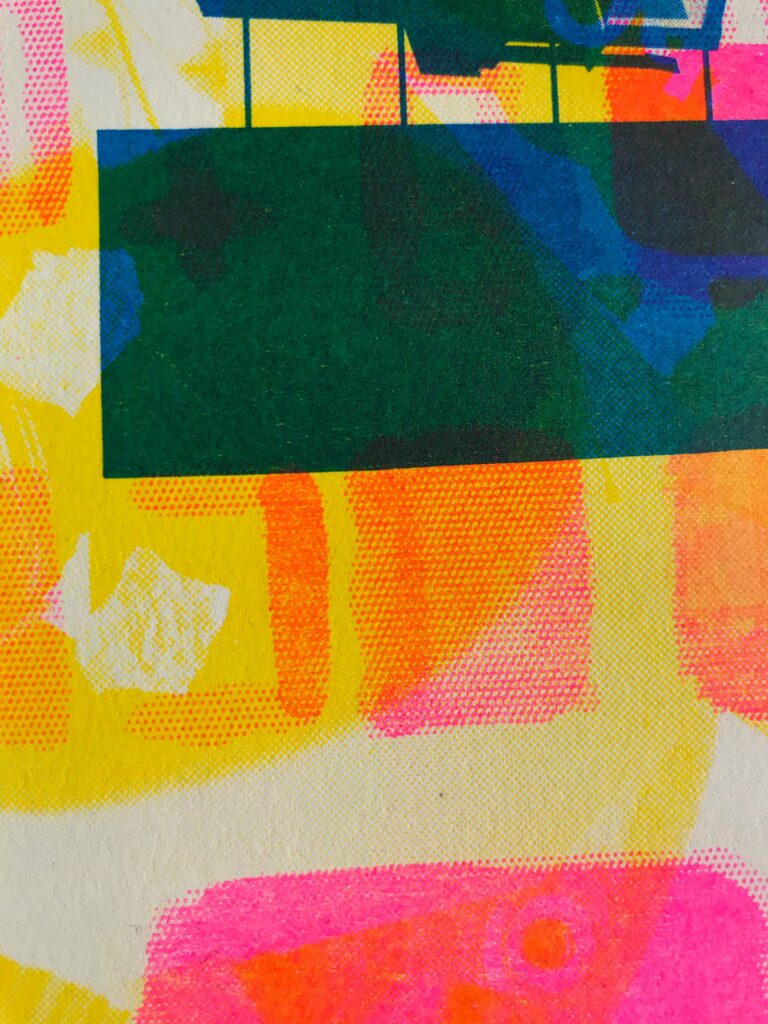 The works were then scanned and layered in different RISO runs, with a different colour for each layer. The result is a series of accidental images generated by combining productions in layers in a random fashion.